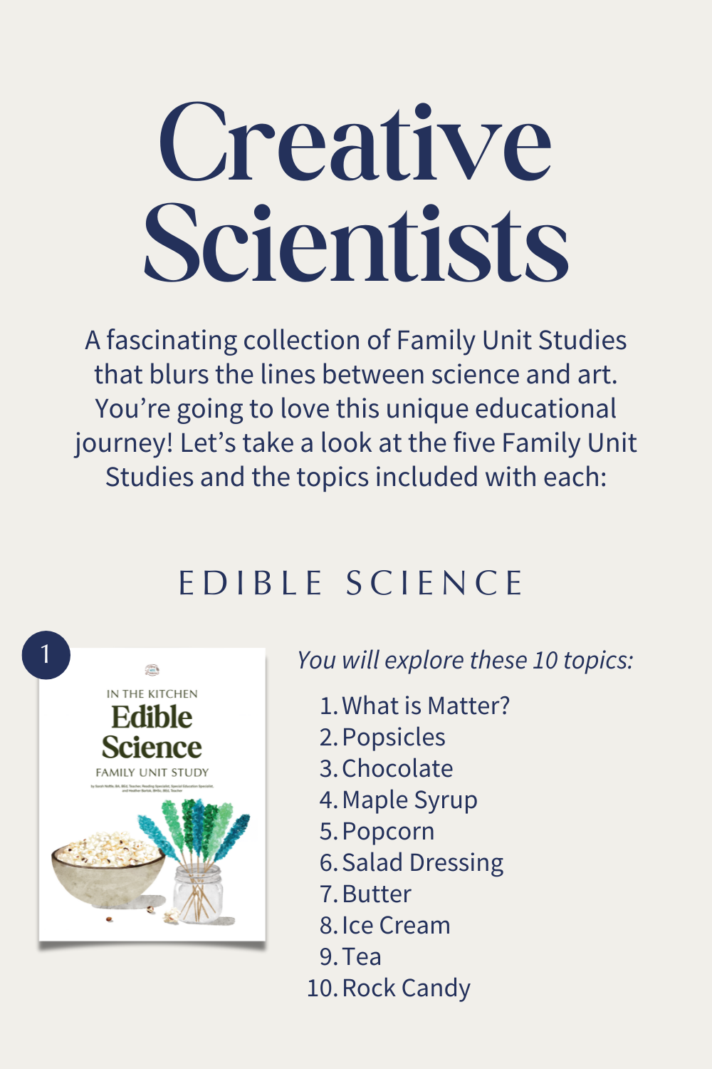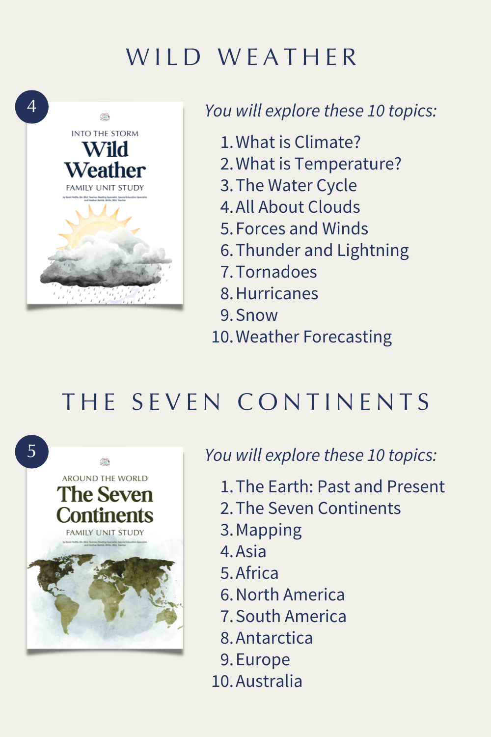 Each Family Unit Study covers a wide variety of subjects, including: math, literacy, science, geography, history, social studies, health, art, music, and life skills!